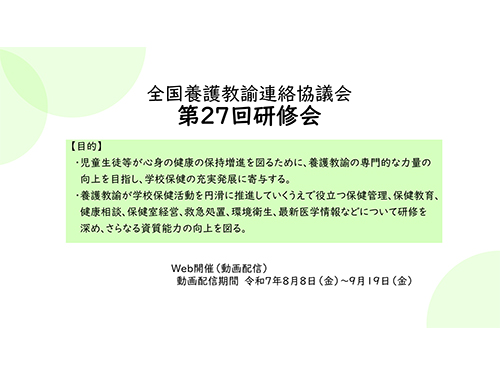 - 児童生徒等が心身の健康の保持増進を図るために、養護教諭の専門的な力量の向上を目指し、学校保健の充実発展に寄与する。